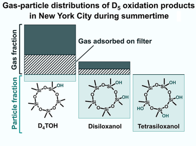 Synopsis: D5 is widely used in personal care products and is demonstrated in this study to form secondary organic aerosol (SOA) in New York City during summertime. The monosiloxanol oxidation product, known as D4TOH, is primarily in the gas-phase and prone to filter sampling artifacts, while more-oxidized polysiloxanol products are predominantly in the particle-phase and may prove useful in source apportionment of personal care product SOA.